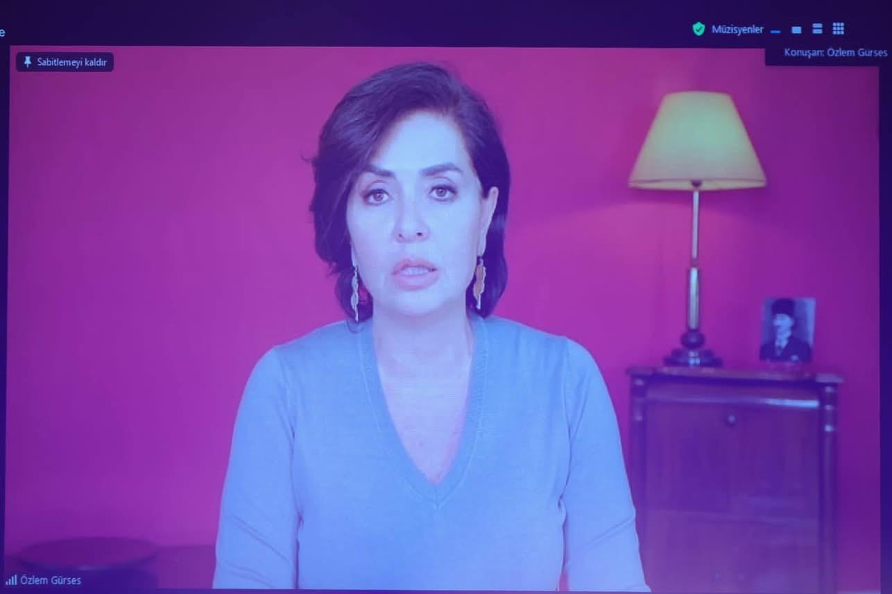 Aldığı ev hapsi cezası nedeniyle elektronik kelepçe takılan ve evinden çevrim içi olarak söyleşiye bağlanan Özlem Gürses dakikalarca alkışlandı…