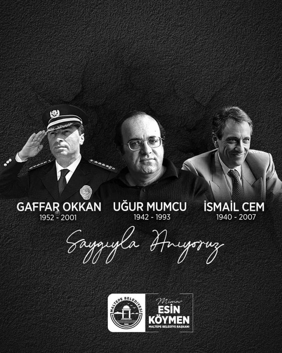Maltepe Belediye Başkanı Mimar Esin Köymen, 24 Ocak 1993 yılında Ankara’da evinin önünde uğradığı bombalı suikast sonucu hayatını kaybeden, Araştırmacı Gazeteci- Yazar Uğur Mumcu, 24 Ocak 2001 günü uğradığı suikast sonrasında hayatını kaybeden Diyarbakır Emniyet Müdürü Ali Gaffar Okkan ve 24 Ocak 2007 yılında hayatını kaybeden Dışişleri ve Kültür Bakanlığı görevlerinde bulunan Siyasetçi-Gazeteci İsmail Cem için bir anma mesajı yayımladı…