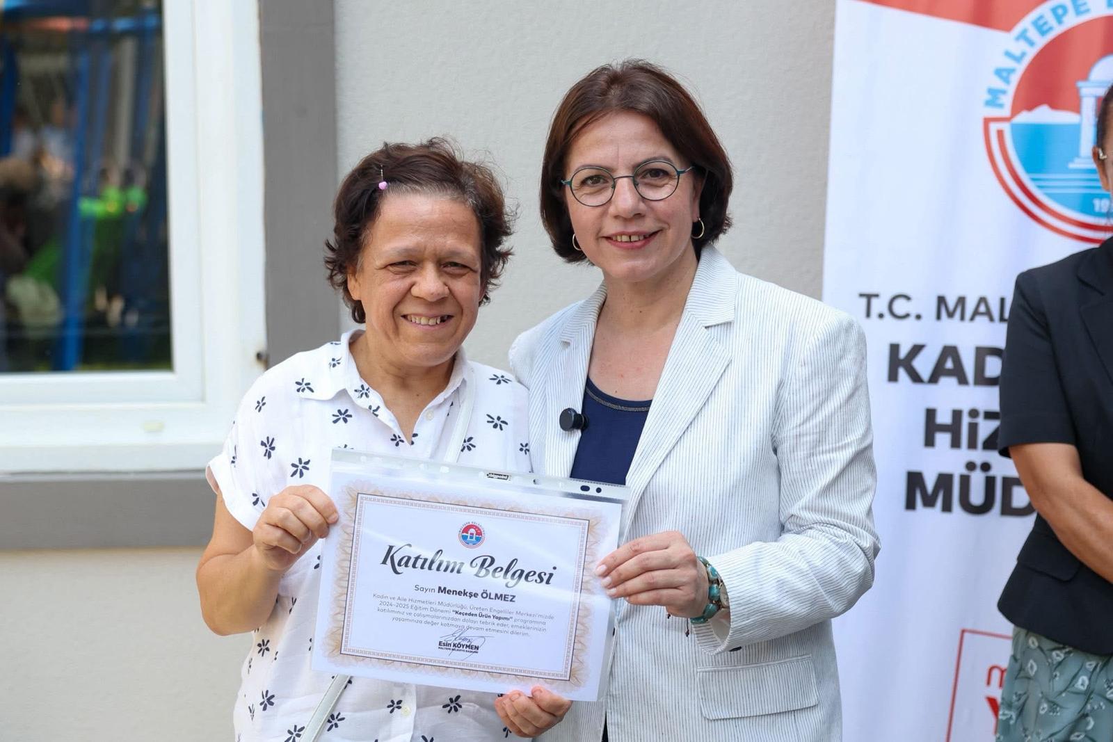 Merkezde sene boyu eğitim alarak çalışan öğrenciler sertifikalarını Maltepe Belediye Başkanı Mimar Esin Köymen’in elinden aldı.