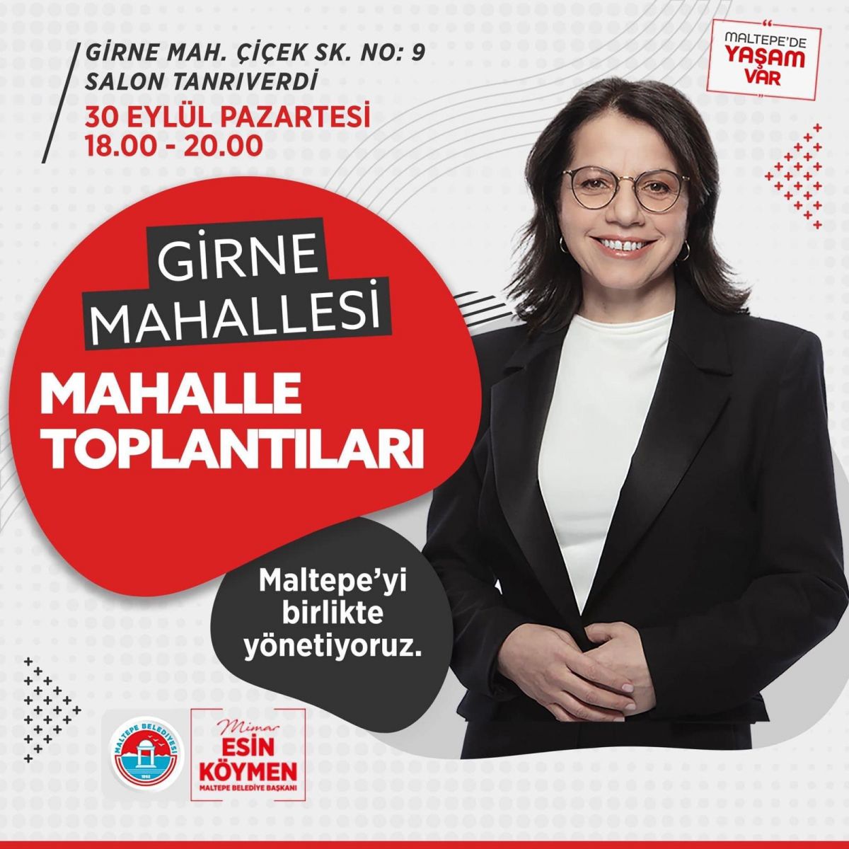 Girne Mahallesi, Çiçek Sokak No: 9 Salon Tanrıverdi adresinde gerçekleştirilecek olan “Girne Mahalle Toplantısı”na vatandaşları katılmaya davet eden Başkan Esin Köymen, davetinde şu ifadelere yer verdi: ”Maltepe’yi birlikte yönetiyoruz!