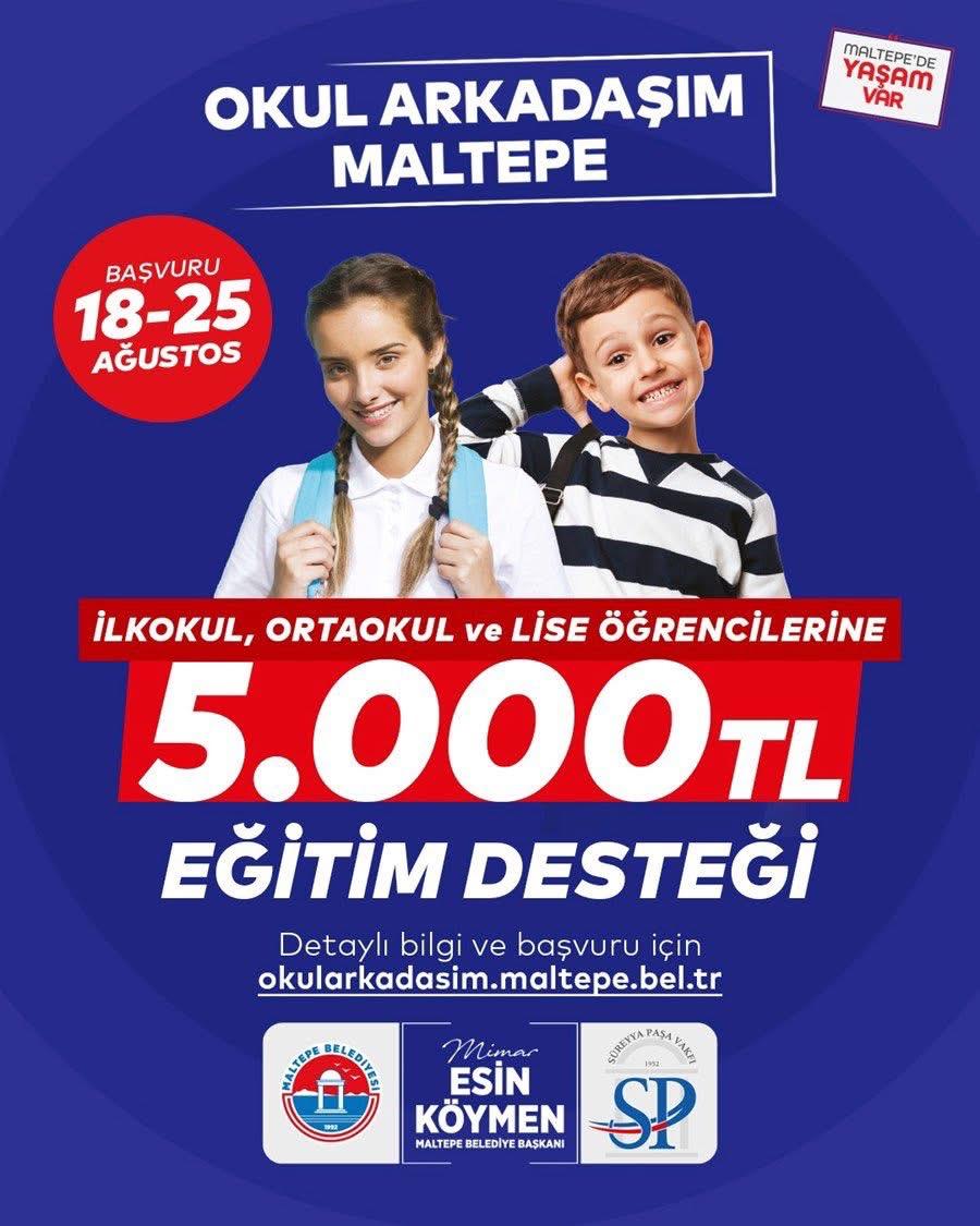 Maltepe Belediye Başkanı Mimar Esin Köymen, sosyal medya hesaplarından yaptığı açıklamada, “Sevgili Maltepeliler, yeni bir eğitim-öğretim yılına başlarken, çocuklarımızın eşit ve nitelikli eğitim hakkına erişimini destekleyecek bir adımı yeniden hayata geçirmenin mutluluğunu yaşıyoruz. Geçtiğimiz öğretim döneminde başlattığımız ‘Okul Arkadaşım Maltepe’ projesi ile 1050 öğrencimize 5 bin lira tutarında eğitim desteği sağlamıştık. Bu dönem de aynı kararlılıkla yolumuza devam ediyoruz. 2025-2026 Eğitim-Öğretim Yılı için, ilkokul, ortaokul ve lise düzeyindeki 1000 öğrencimize tek seferlik 5.000 TL eğitim desteğimizi yeniden sunacağımızı sizlerle paylaşmak istiyorum.” dedi.