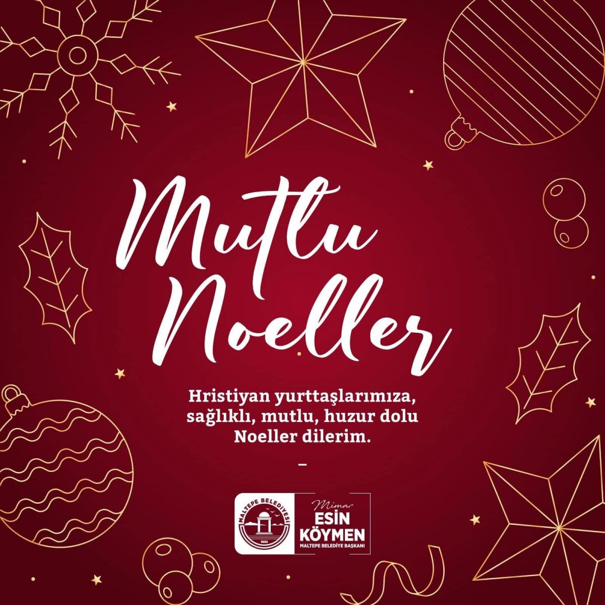 Başkan Esin Köymen mesajında; “Hristiyan yurttaşlarımızın Noel Bayramı’nı kutluyor, tüm dünyaya barış, sevgi ve kardeşlik getirmesini diliyorum.” ifadelerini kullandı...