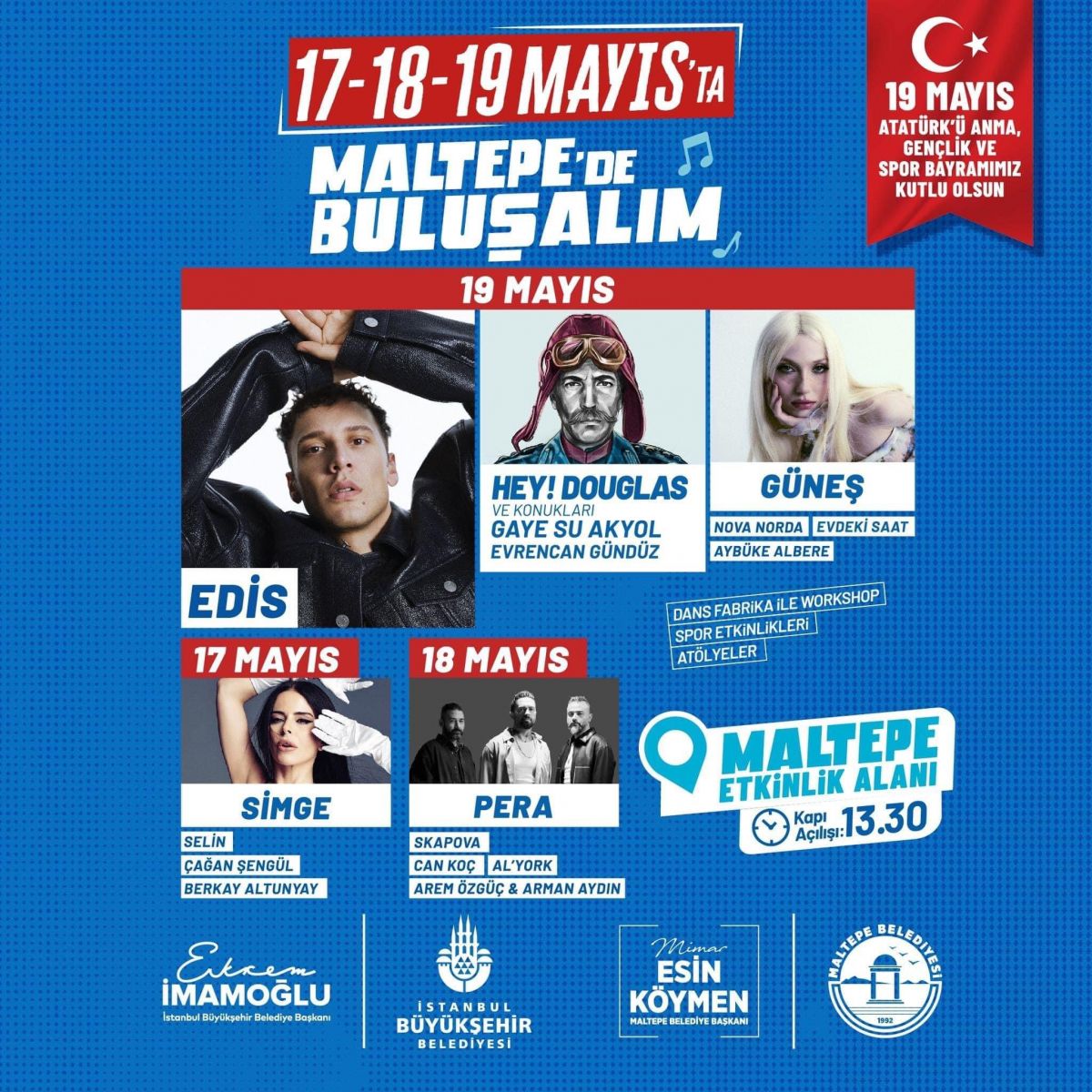 Gazi Mustafa Kemal Atatürk’ün gençliğe armağanı olan 19 Mayıs Atatürk’ü Anma Gençlik ve Spor Bayramı dolayısıyla gerçekleştirilecek olan kutlamalar; Maltepe Etkinlik Alanı’nda 17-18-19 Mayıs tarihlerinde düzenlenecek olan konserlerle başlayacak...