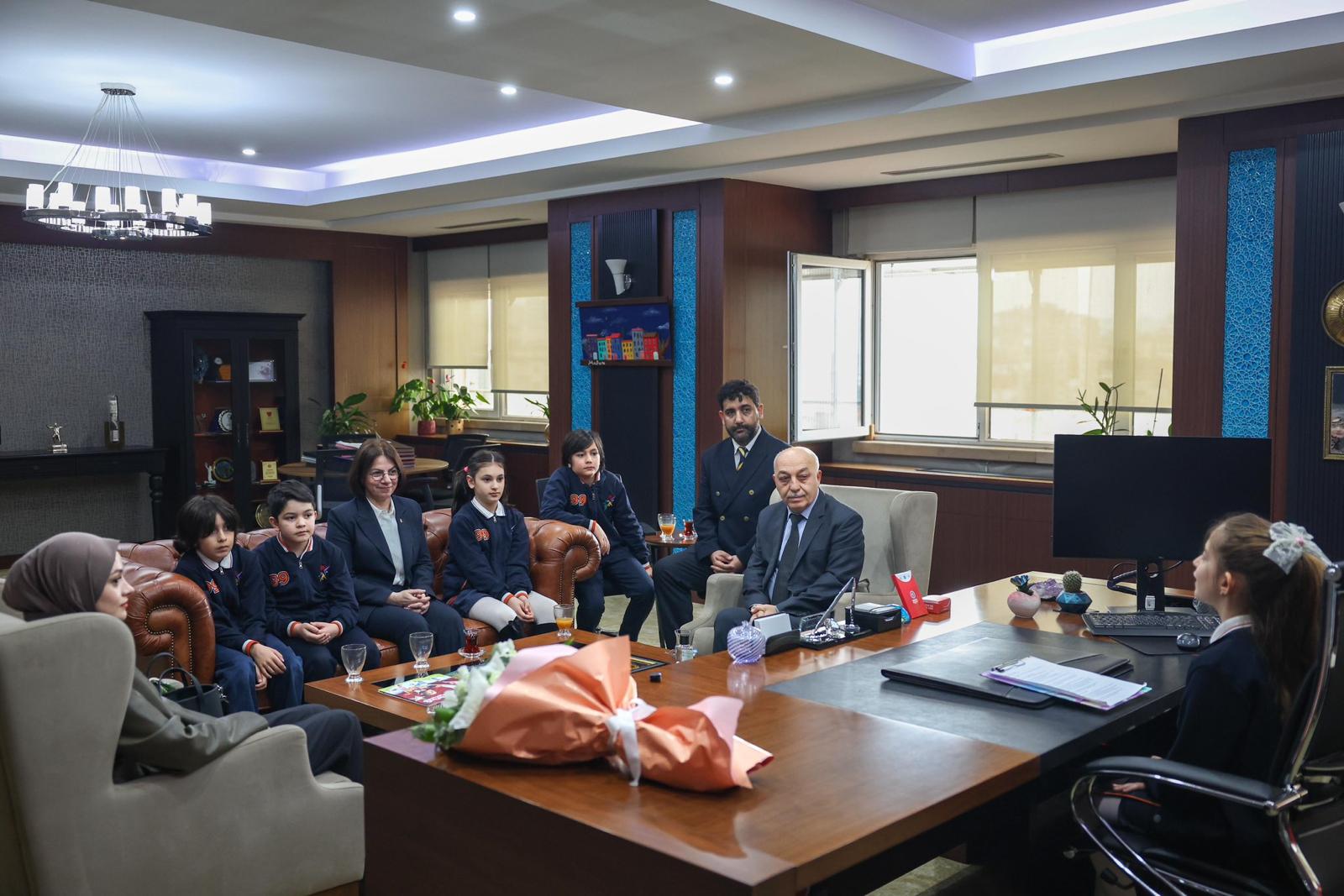Başkan Esin Köymen, etkinlikler çerçevesinde TEV Abdullah Nezahat Erboz İlköğretim Okulu müdürü ve beş öğrenciyi makamında ağırladı. Renkli görüntülere sahne olan buluşmada öğrenciler, sırayla başkanlık koltuğuna oturarak temsili olarak görevi devraldı.
