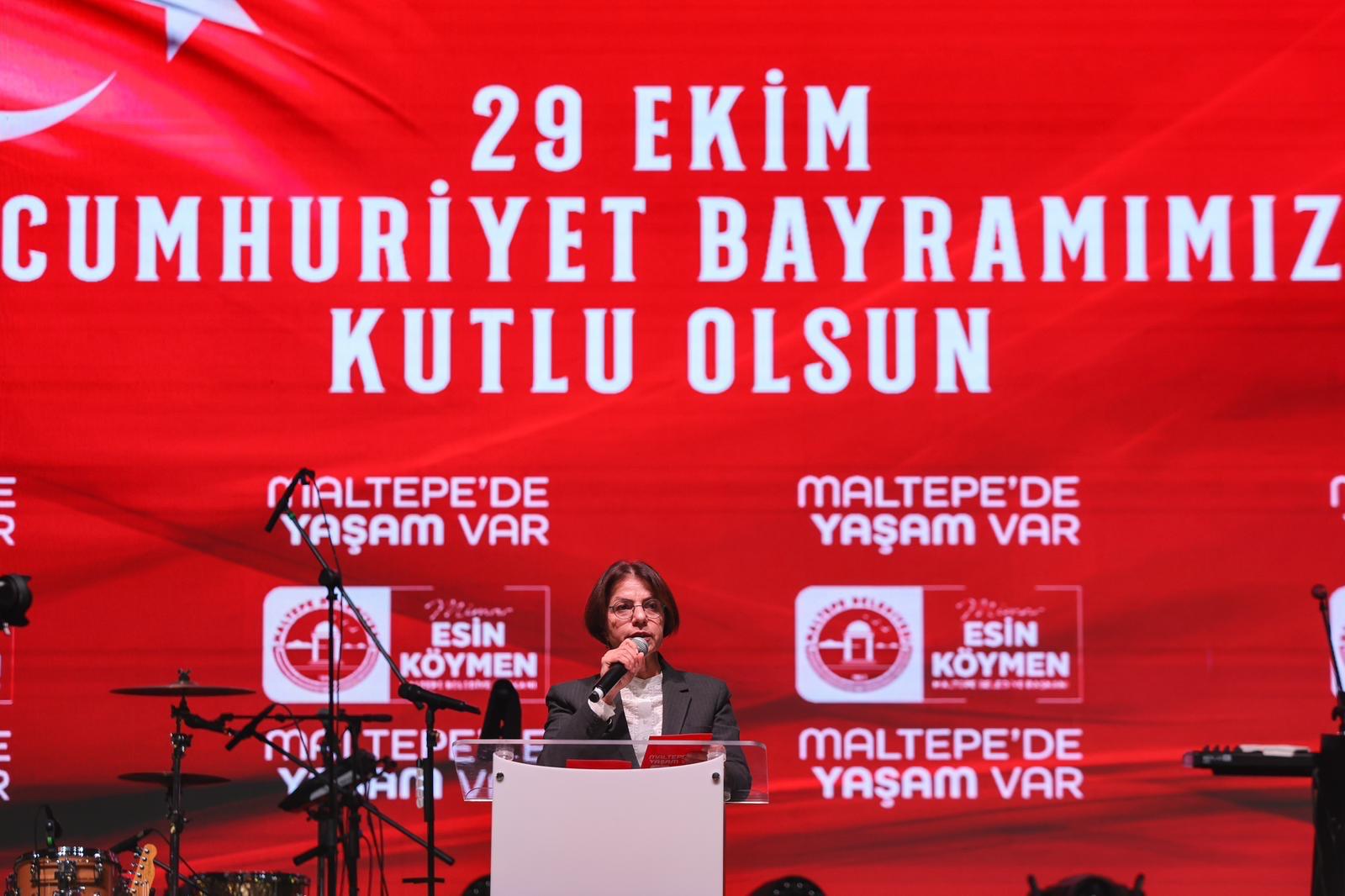 Meydanda düzenlenen etkinlik alanında günün anlam ve önemine ilişkin bir konuşma yapan Maltepe Belediye Başkanı Mimar Esin Köymen, “Cumhuriyet karanlıktan aydınlığa, umutsuzluktan dirilişe uzanan bir yolculuğun, aklın ve bilimin rehberliğinde inşa edilmiş bir geleceğin adıdır. Bugün o büyük emanetin mirasçıları olarak, Atatürk’ün gösterdiği çağdaş uygarlık yolunda yürümek, bu büyük cumhuriyeti daha ileriye taşımak ise hepimizin ortak sorumluluğudur. Bir kılavuz, bir rehber arıyorsak dönüp 102 yıl önce bu Cumhuriyet’i kuranlara bakacağız. O gün umut oradaydı, bugünse umut burada. Bu emaneti gelecek kuşaklara daha güçlü bir şekilde bırakacağız. Ulu önderimiz Gazi Mustafa Kemal Atatürk’ü, silah arkadaşlarını ve Cumhuriyetimizin tüm kurucu kahramanlarını minnet, saygı ve özlemle anıyorum. Yaşasın Cumhuriyet, yaşasın Mustafa Kemal Atatürk, Yaşasın tam bağımsız, güçlü ve mutlu Türkiye.” diye konuştu.
