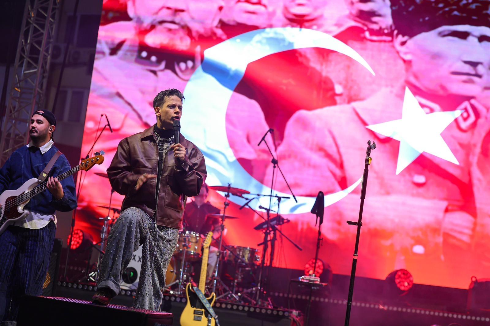 Meşaleler, Atatürk posterleri ve bayraklar eşliğinde, bando gösterisiyle gerçekleştirilen fener alayı sonrası Madrigal grubu sahne aldı.