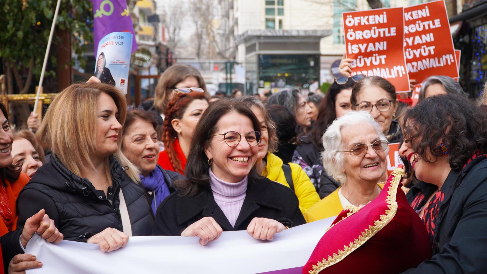 Tulum eşliğinde ve horonlarla devam eden yürüyüşün ardından Esin Köymen, “Kadınların gücü kamusal alanda ne kadar bastırılmaya ne kadar göz önünden çekilmeye çalışılırsa çalışılsın, bizler bir arada olmaya, her alanda dayanışmaya ve mücadeleyi yükseltmeye devam edeceğiz” dedi.