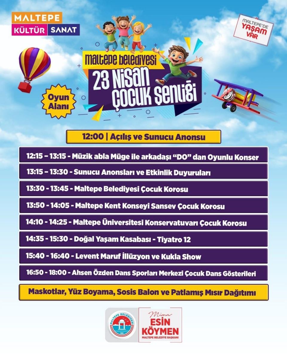Maltepe Cumhuriyet Meydanı’nda 12.00-18.00 saatlerinde ücretsiz gerçekleşecek şenlikte; Müzik abla Müge ile arkadaşı “DO” dan Oyunlu Konser, Maltepe Belediyesi Çocuk Korosu, Maltepe Kent Konseyi SANSEV Çocuk Korosu, Maltepe Üniversitesi Konservatuvarı Çocuk Korosu birbirinden renkli şarkılarını çocuklar için seslendirecek.