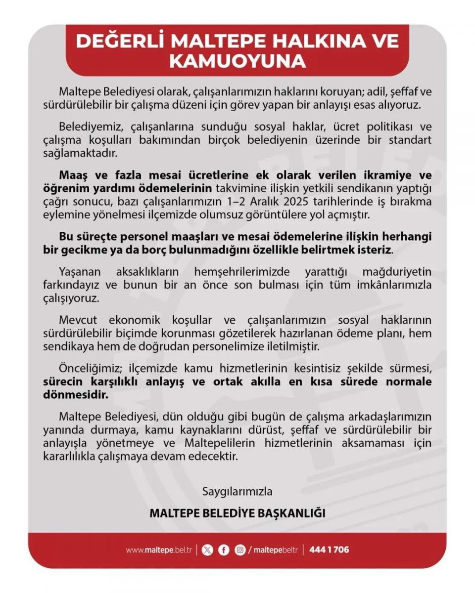 Maltepe Belediyesi; personel maaşları ve mesai ödemelerine ilişkin herhangi bir gecikme ya da borç bulunmadığının altının çizildiği açıklamada şu ifadelere yer verildi: “Maltepe Belediyesi olarak, çalışanlarımızın haklarını koruyan; adil, şeffaf ve sürdürülebilir bir çalışma düzeni için görev yapan bir anlayışı esas alıyoruz.
