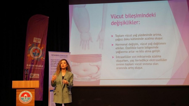 Beslenme ve Diyet Uzmanı Yüksel Esra Aydın ise menopozda toplam vücut yağ yüzdesinde artış, yağsız doku kütlesinde azalma olduğunu, hormonal değişimin vücut yağ dağılımını etkilediğini özellikle karın bölgesinde yağlanmanın arttığını ve kilo almanın geliştiğini söyledi...