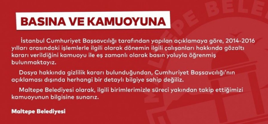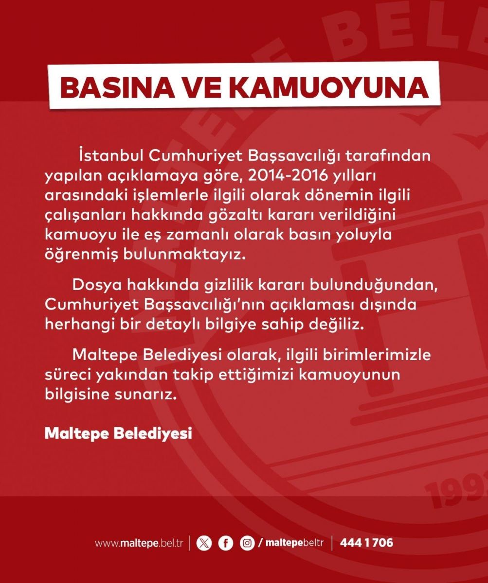 Maltepe Belediyesi, İstanbul Cumhuriyet Başsavcılığı’nca başlatılan soruşturma sonucu düzenlenen operasyon üzerine sosyal medya hesapları ve web sitesinden açıklama yaptı.