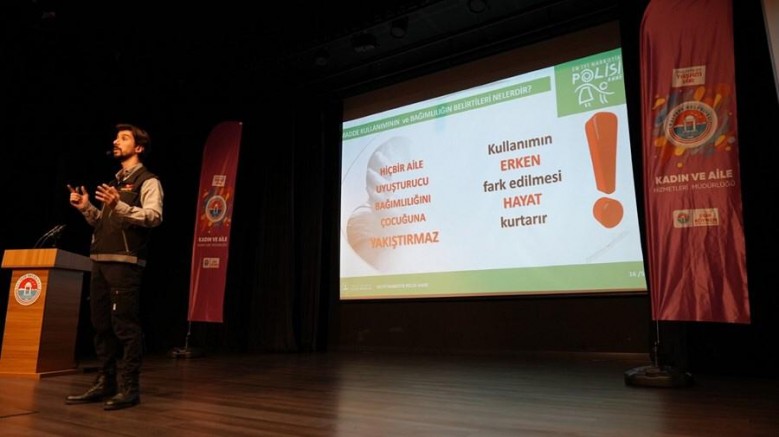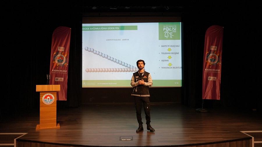 Seminere konuşmacı olarak katılan Narkotik Suçlarla Mücadele Şube Müdürlüğü TUBİM Büro Amirliği’nden Polis Memuru Emrah Akkurt, uyuşturucunun sosyolojik, fiziksel ve ekonomik olarak toplumları zayıf düşüren nedenlerden biri olduğunu, özellikle genç nesilleri tehdit ederek toplumların geleceğine zarar verdiğini söyledi...