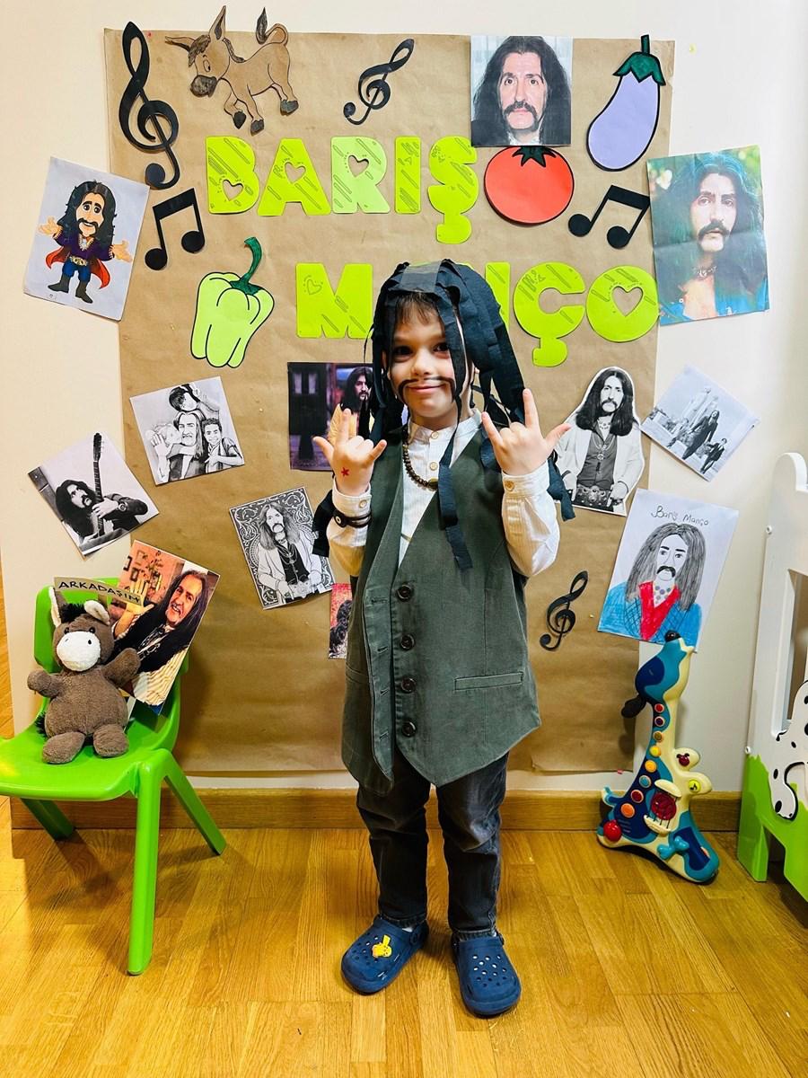 Çocuklar, Manço’yla özdeşleşen uzun saçları, otantik kıyafetleri, bilezik, yüzük ve kemerle tasarladığı imajına uygun giyinerek hatıra fotoğrafı çektirdiler.