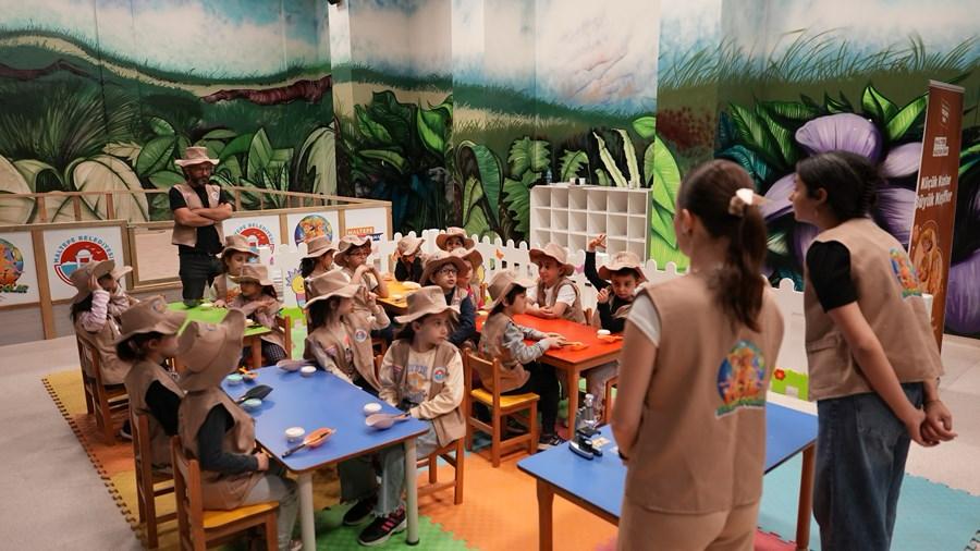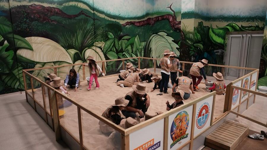 Çocuklar arkeologlar eşliğinde nesli tükenen pek çok dinozor maketinin bulunduğu alanda oluşturulan kum havuzunda kazı çalışması yapıp arkeolojik kazıların incelikleri hakkında bilgi sahibi oldular.