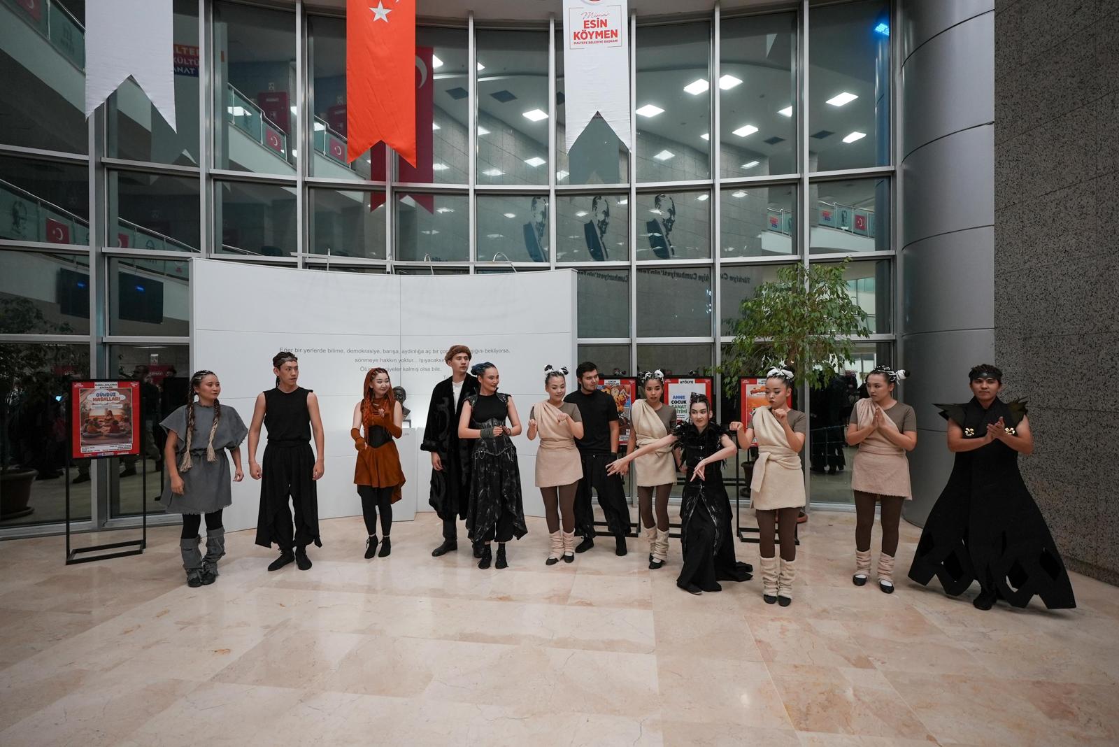 Açılış konuşmaları sonrası Kazakistan Zhastar Akimata Laboratory Dance Theatre’ın “Siyah Pelerin” isimli dans ağırlık tiyatro gösterisi sahnelendi. Aşk, sadakat, ihanet ve ahlaki sınavlar üzerine kurulan oyunda; pragmatizmin ve gücün hâkim olduğu bir dünyada, hayvanlara insani özellikler verilerek alegorik bir anlatım kullanıldı. Zamanın eskimeyen en acı ve en güncel meseleleri, insanın özü, sorumluluk ve ruhsal değerler üzerinden eleştiriye tabi tutuldu ve herkesin bu sorunlar hakkında düşünmesinin önemine değinildi.